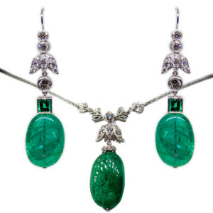 Cabochon Emerald and Diamond Pendant Necklace and Earring Set