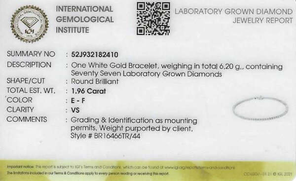 One White Gold Bracelet, weighing in total 6.20 g., containing Seventy Seven Laboratory Grown Diamonds. Accompanied with IGI (International Gemological Institute) Certification stating: Shape/Cut: Round Brilliant, Total Weight: 1.96 carats of lab grown diamonds, Color: E-F, Clarity: VS.