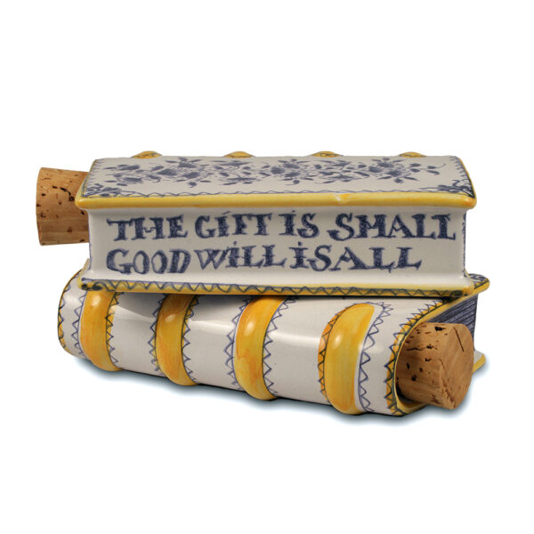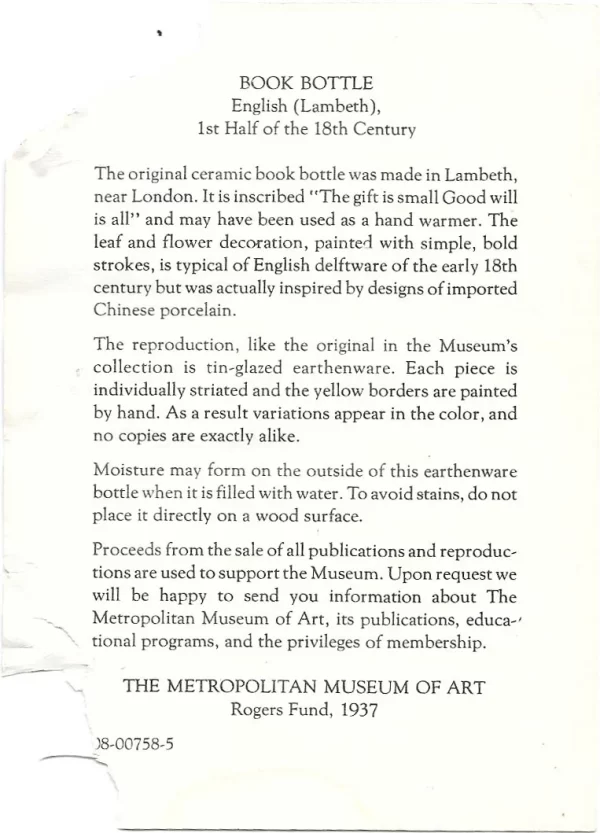 These two items come in a set. Tin-Glazed earthenware. Reproductions of early 18 century bottles. The reproductions are from 1937. May have been used as hand warmers when filled with warm water. Inscription reads, “The gift is small Good will is all”