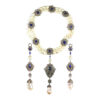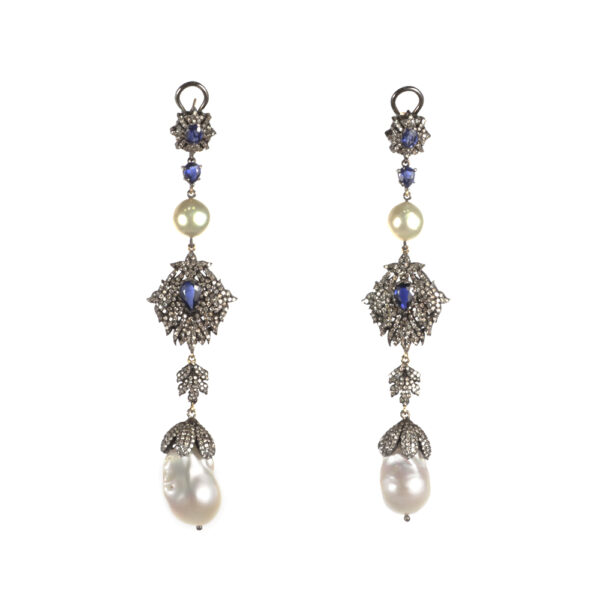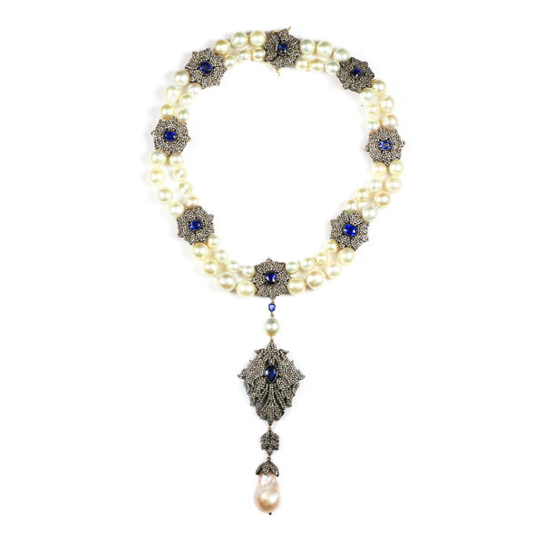 Kyanite, Diamond, and Pearl Necklace & Earring Suite. Necklace accompanied by 13.51 carats of kyanite, 13.63 carats of diamonds, and 430.55 carats of pearls. Earrings accompanied by 1.45 carats of kyanite, 2.50 carats of diamonds, and 22.50 carats of pearls. TOTAL WEIGHT: 14.96 carats of kyanite, 16.13 carats of diamonds, 453.05 carats of pearls. Similar in style to Elizabeth Taylor’s own La Peregrina pearl necklace, which dates back to the 1500s and was custom set in a necklace design by Cartier for Taylor.