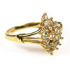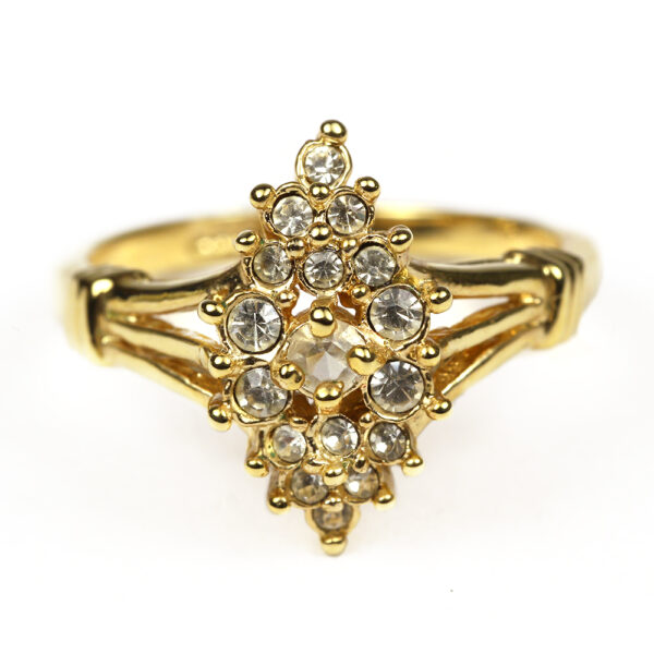 Simulated diamond ring set in a gold based metal. Size 9.